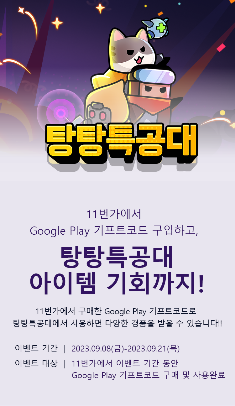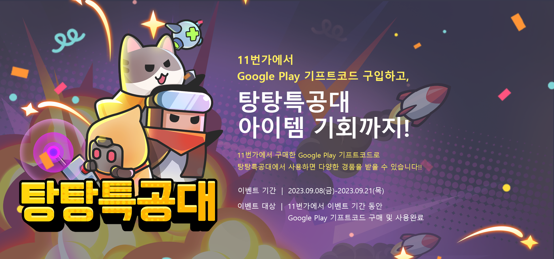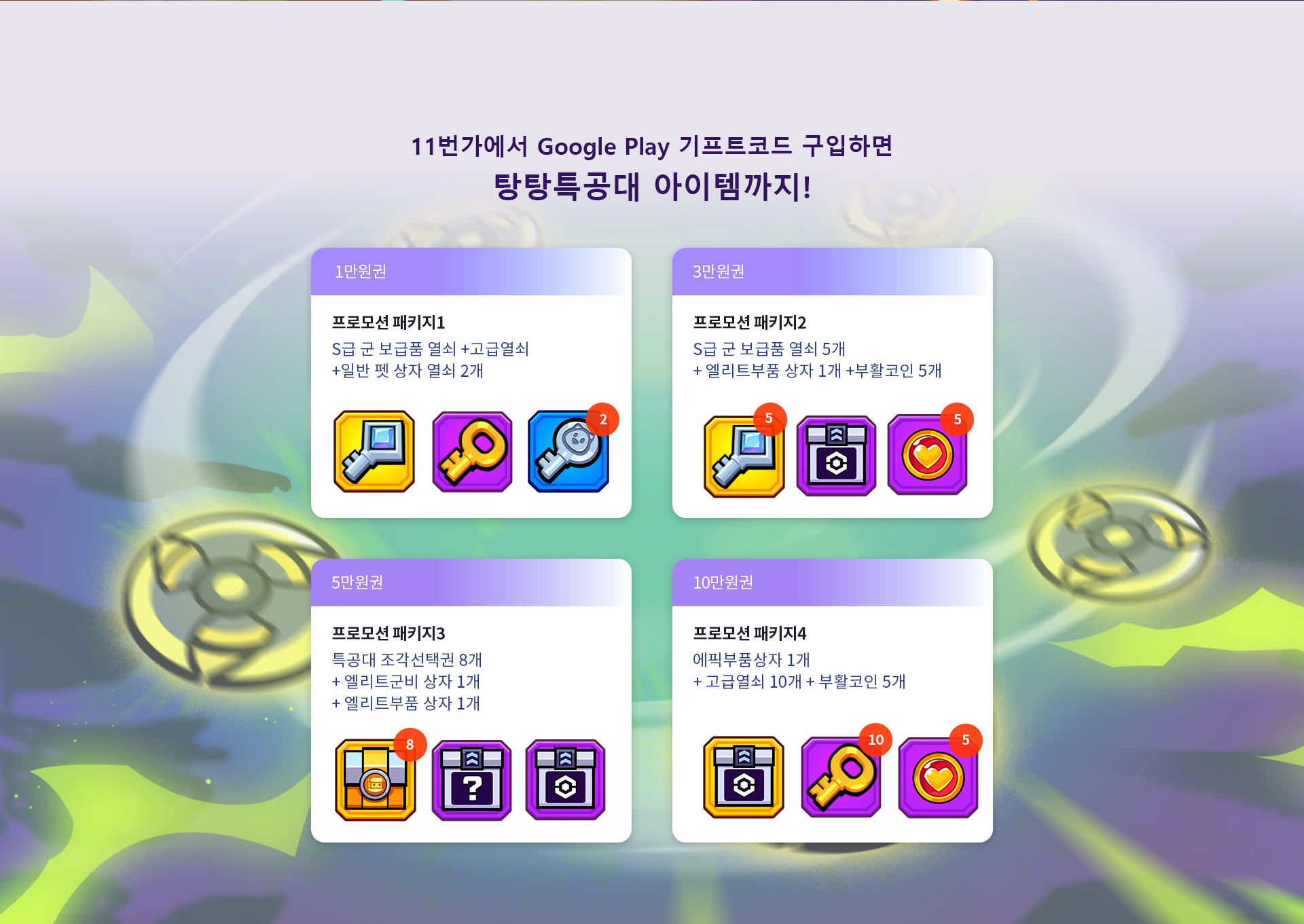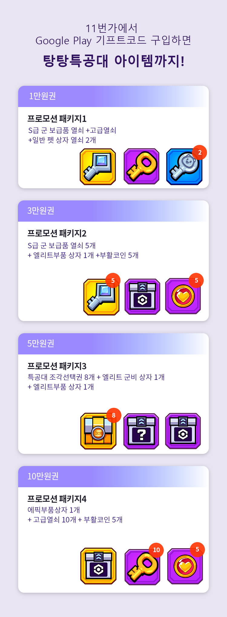 - Google Play 기프트코드 구매 시 탕탕특공대 아이템이 지급됩니다. 아이템 지급 혜택은 계정 당 각 권종 구간별 1회 참여 가능하며 구매 개수 제한은 없습니다.