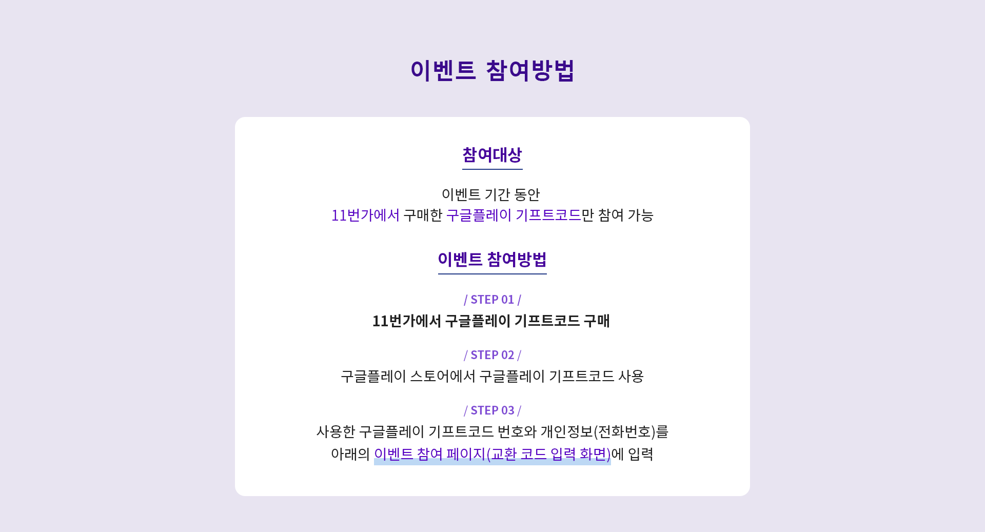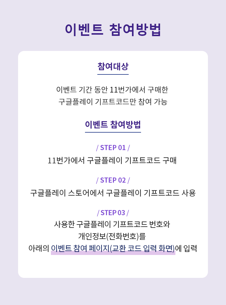 - 11번가에서 이벤트 기간 내 Google Play 기프트코드 구매 및 사용완료 후 참여가능한 이벤트 입니다.