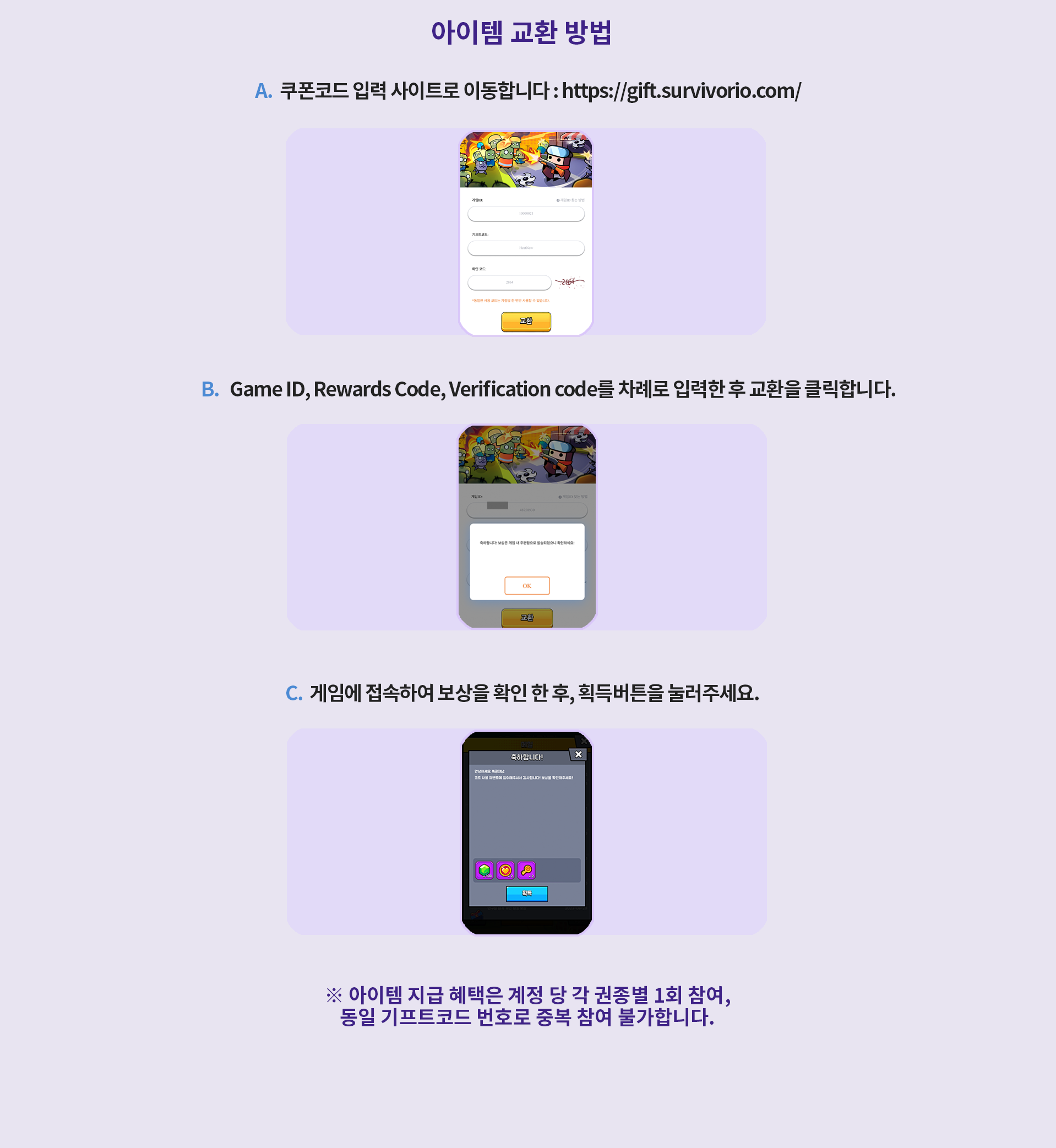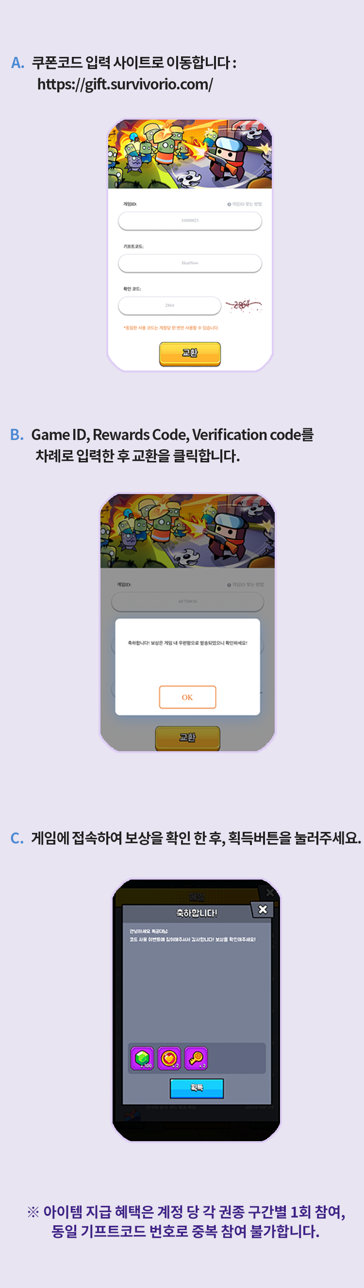 - 아이템 지급 혜택은 계정 당 각 권종 별 1회 참여/ 동일 기프트카드 번호로 중복 참여 불가합니다.