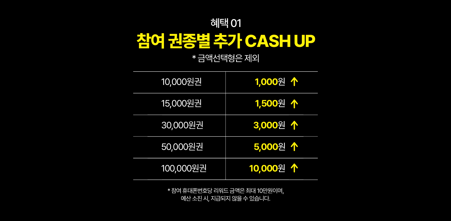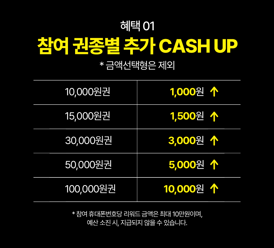 - 본 이벤트 혜택1의 참여 전화번호당 최대 리워드 금액은 10만원입니다.