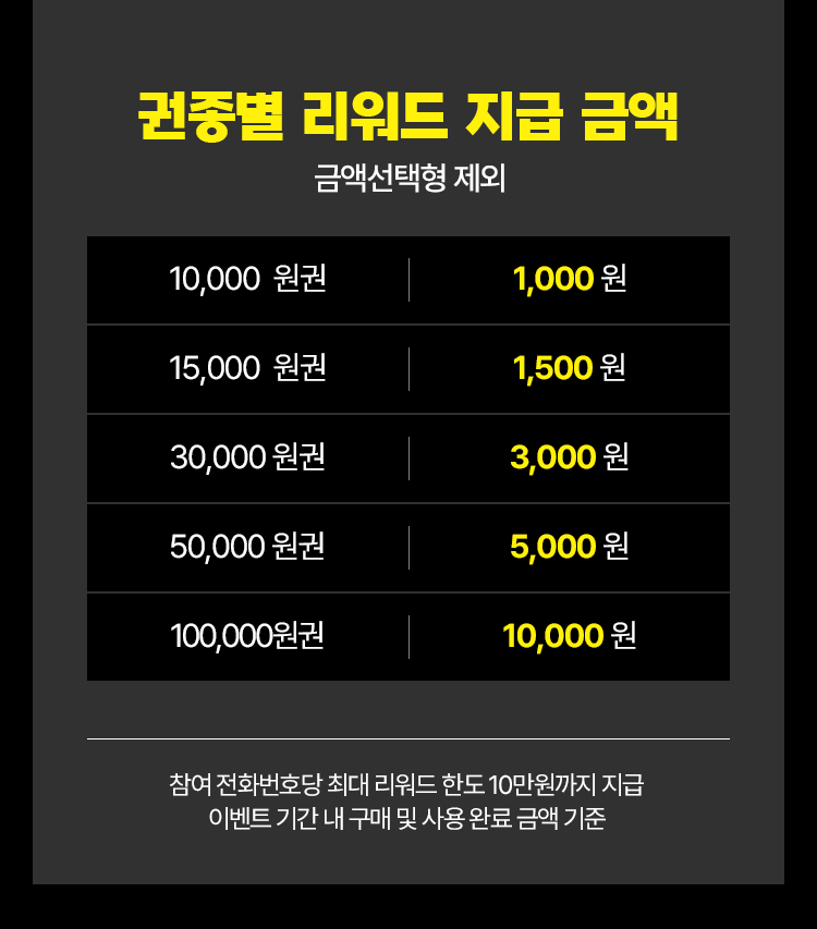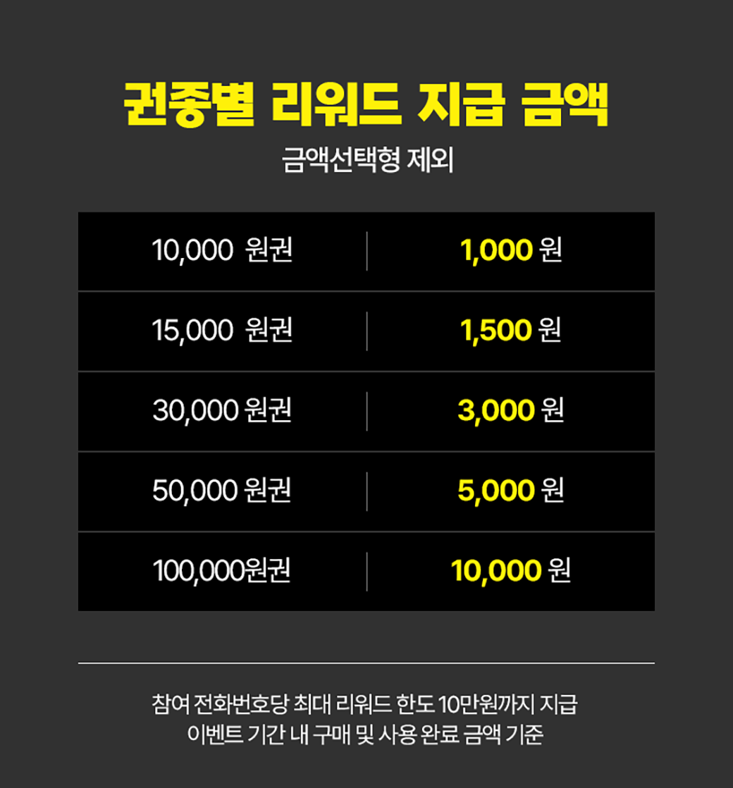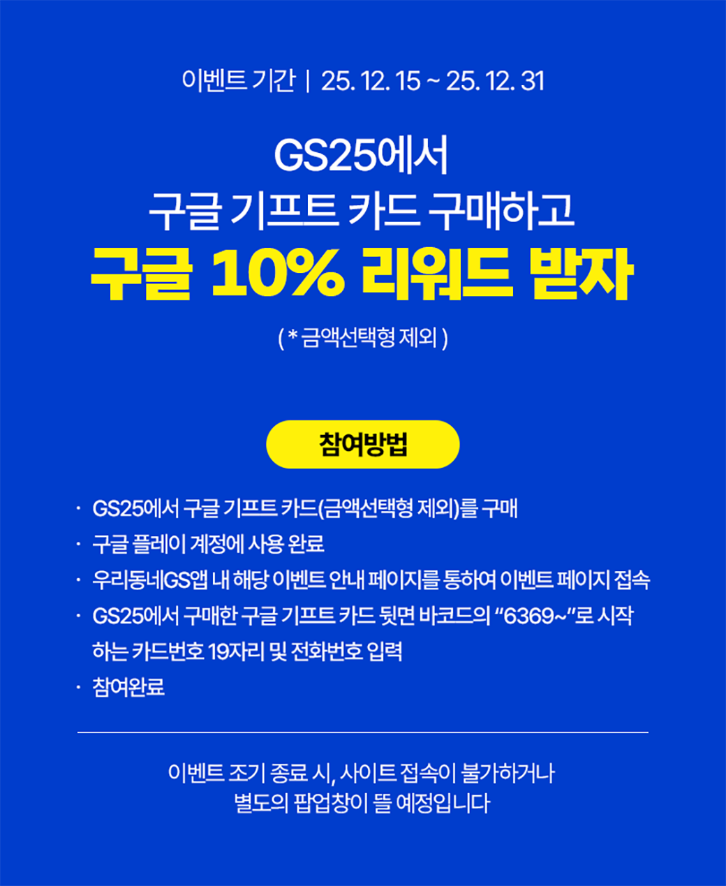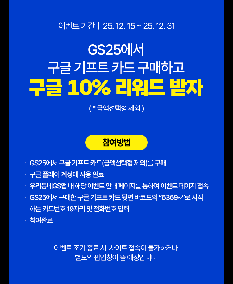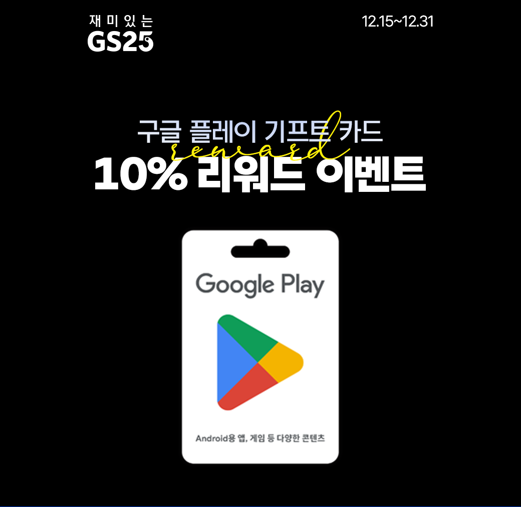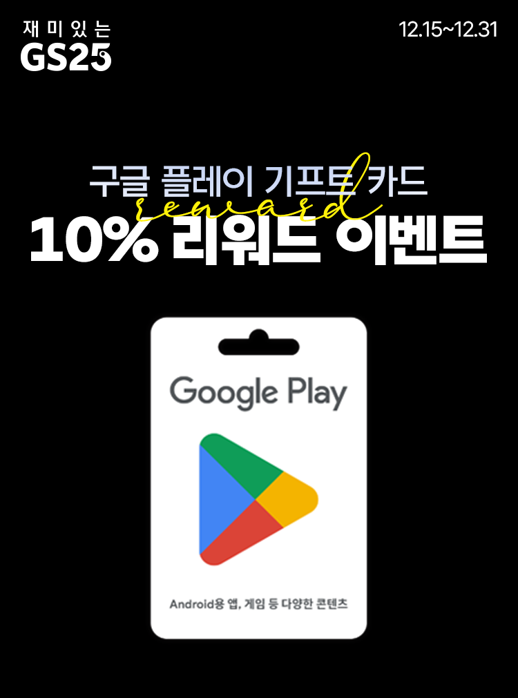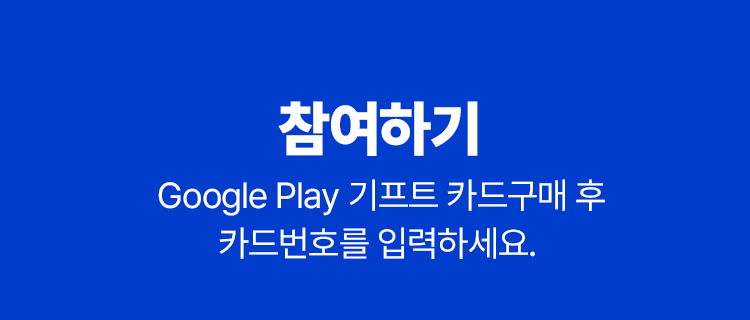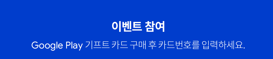 - 본 이벤트는 구글 플레이 기프트 카드 금액선택형을 제외한 모든 권종 (1만/1.5만/3만/5만/10만원권) 구매 및 등록 시 참여 가능합니다.